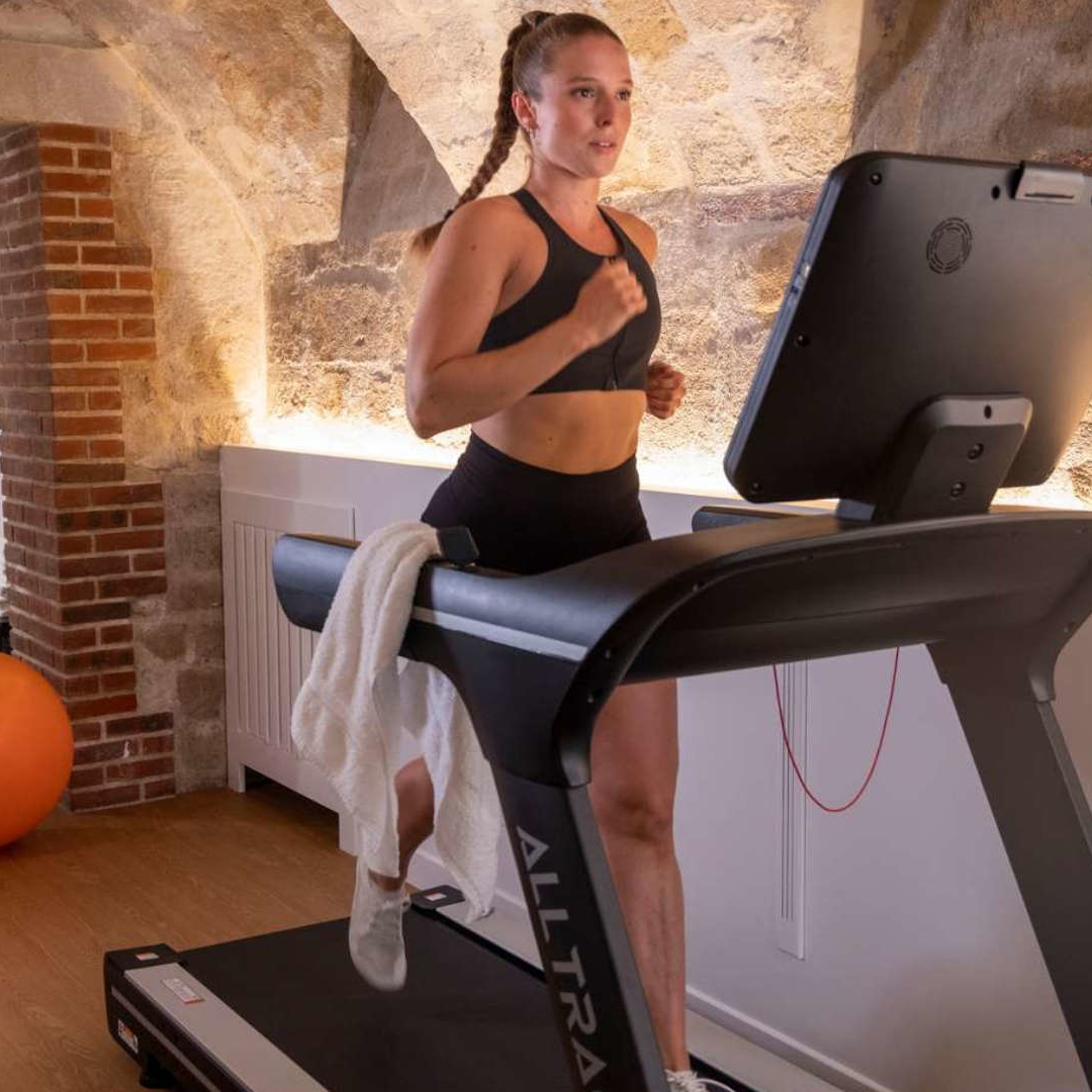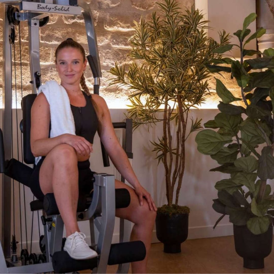 En el sótano del hotel, la bodega abovedada ha sido completamente renovada y transformada en una sala de fitness. Aquí se han conservado las piedras a la vista y la tenue iluminación confiere al lugar un ambiente íntimo propicio para la concentración y la relajación..
